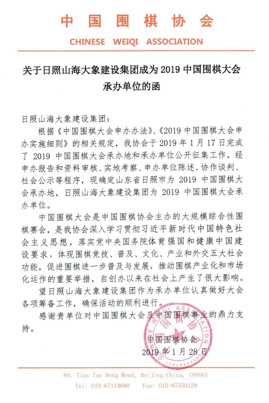 1月28日,中国围棋协会发布文件,正式宣布山海大象集团成为2019中国围棋大会承办单位。
